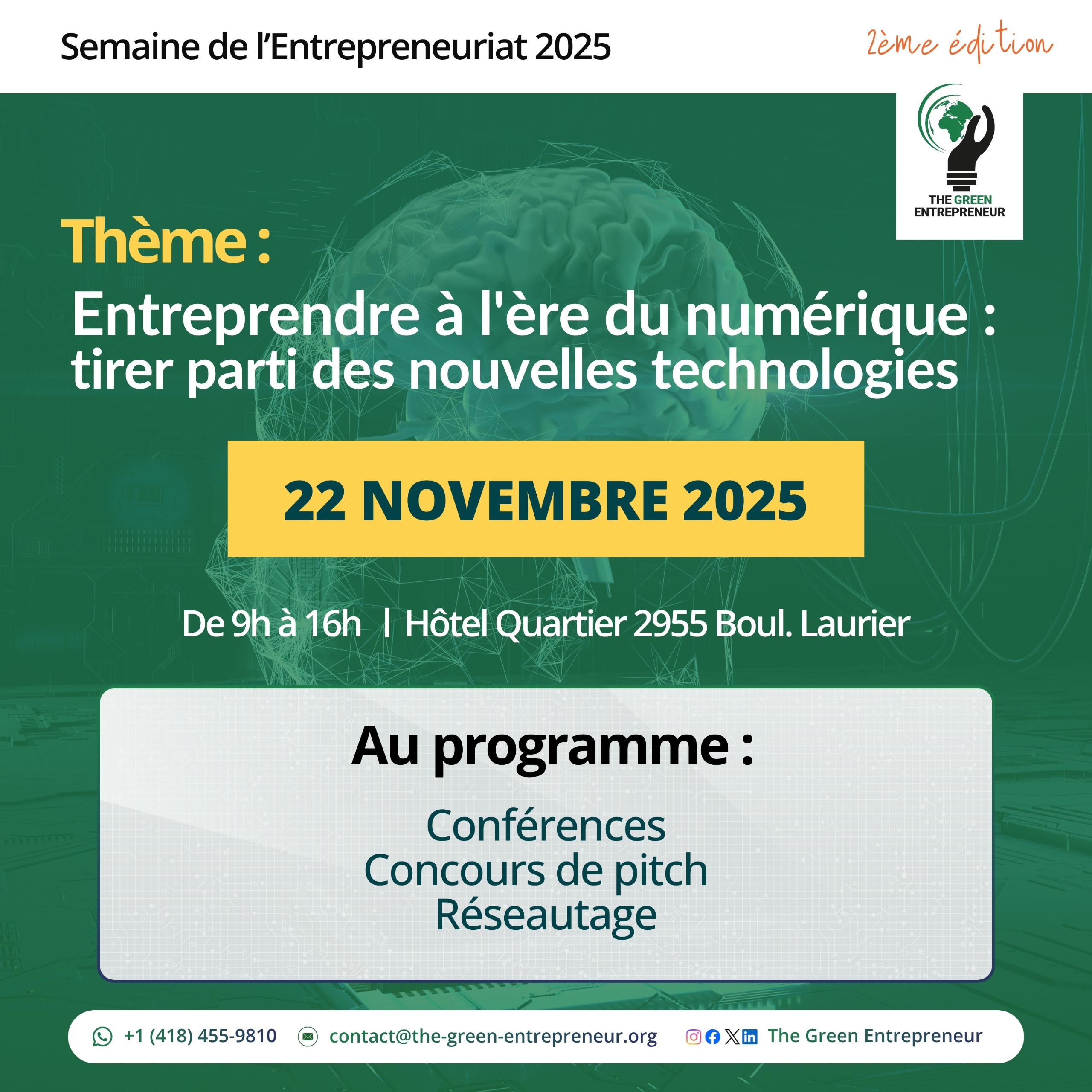 2ᵉ Édition de la Semaine de l’Entrepreneuriat. The Green Entrepreneur vous invite à une journée exceptionnelle sur le thème 🎯 « Entreprendre à l’ère du numérique : tirer parti des nouvelles technologies ». Au programme : conférence, concours de pitch, espace d’exposition et réseautage — une expérience unique pour innover, partager et se connecter ! 👉 S’inscrire à l’événement!